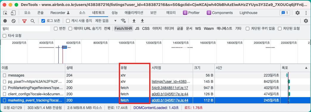 Fetch API를 사용하여 데이터를 요청한 경우 유형은 fetch, Fetch API 이외의 방식은 xhr로 표시됩니다.(Axios도 xhr로 표시됩니다.)