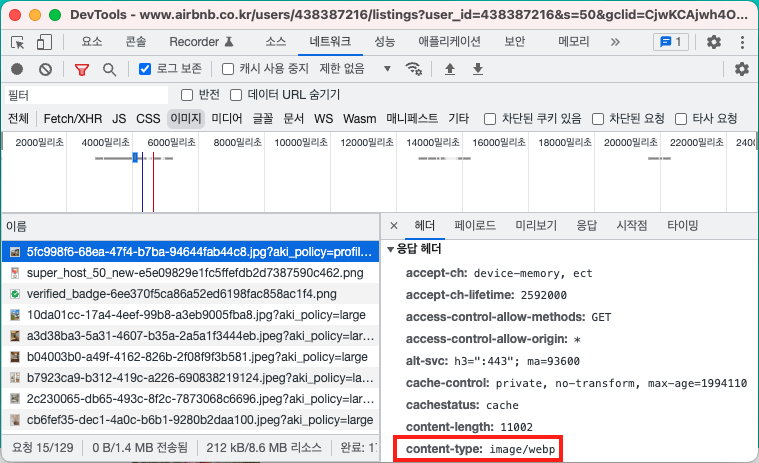 요청에 대한 응답 헤더를 보면 content-type이 image/webp인 것을 확인할 수 있습니다.
