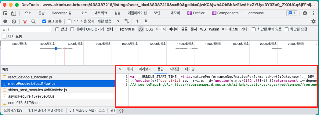 요청에 대한 응답을 보면 JavaScript 문법이 존재하는 것을 확인할 수 있습니다.