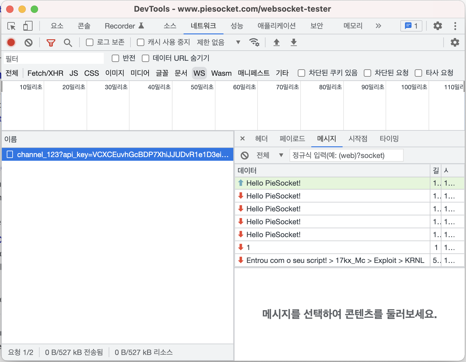 페이지 접속 후 크롬 개발자 도구의 네트워크 탭을 확인하면 WS에 요청(Request)이 발생하는 것을 볼 수 있습니다.