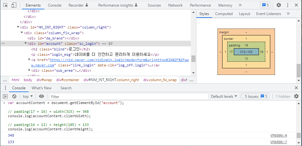 로그인 영역의 id 속성이 account이므로 document.getElementById() 메서드에 문자열 "account"를 전달하고 offsetWidth, offsetHeight 프로퍼티를 사용하여 넓이와 높이를 가져옵니다.