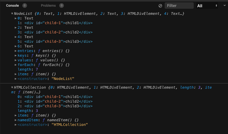 - childNodes 프로퍼티는 자식 노드를 NodeList 객체로 반환하고 children 프로퍼티는 자식 노드를 HTMLCollection 객체로 반환합니다.