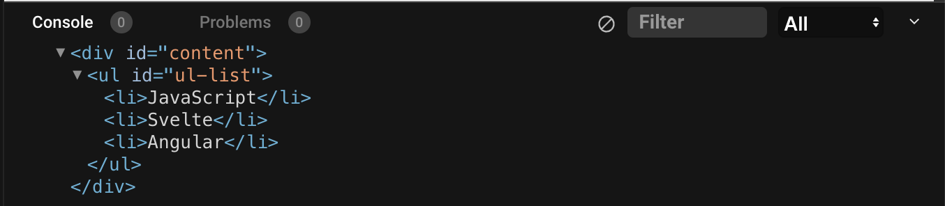 아래는 cloneNode() 메서드에 true를 전달하여 id가 "content"인 HTML 요소를 깊은 복제 후 반환 결과를 콘솔에 출력합니다.