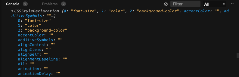 style 프로퍼티는 CSSStyleDeclaration 객체를 반환하며, 값이 설정된 css 프로퍼티는 인덱스로 접근할 수 있습니다.