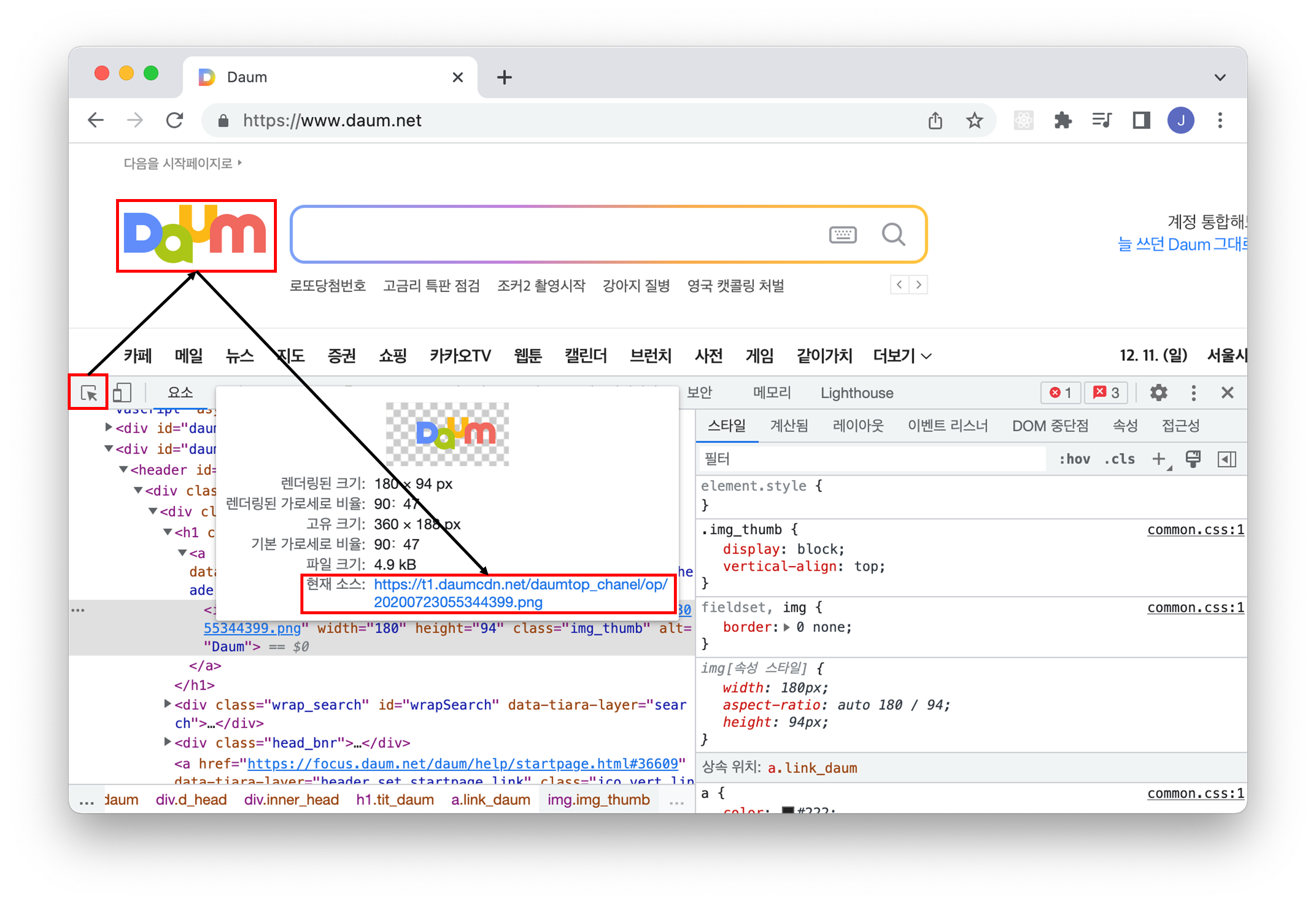예를 들어, 다음 메인 사이트의 로고 사진을 가져와서 보여주고 싶다고 가정합시다.