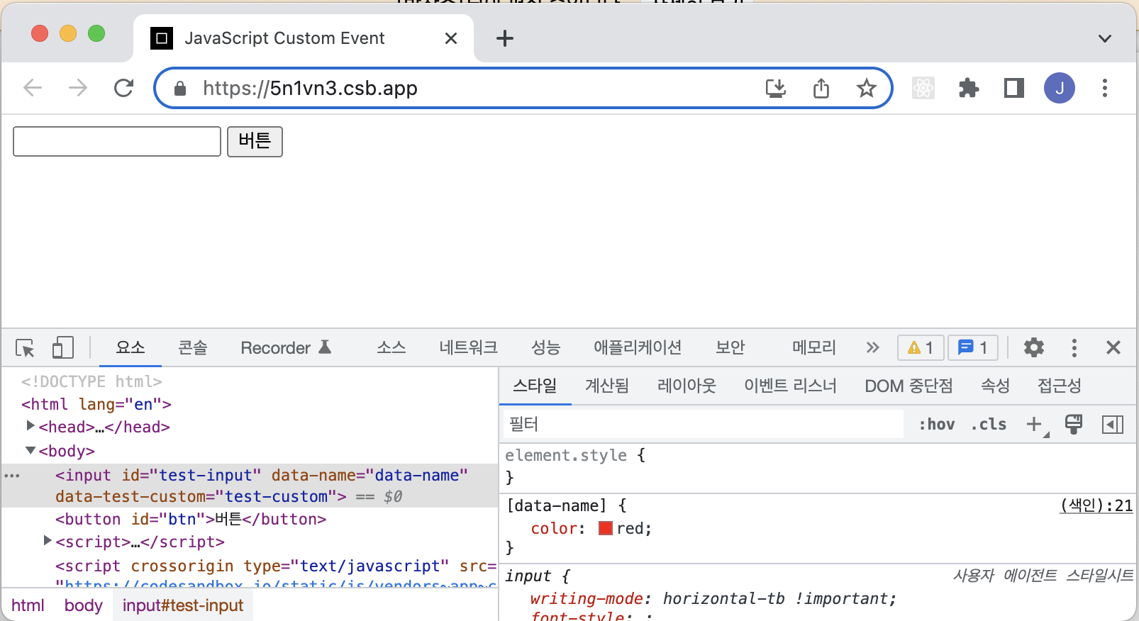 버튼을 클릭하면 data-name, data-test-custom 애트리뷰트가 추가된다. 특이한 점으로 JavaScript에서 추가한 testCustom 프로퍼티가 HTML 요소에서 test-custom으로 변경된 것을 볼 수 있다.