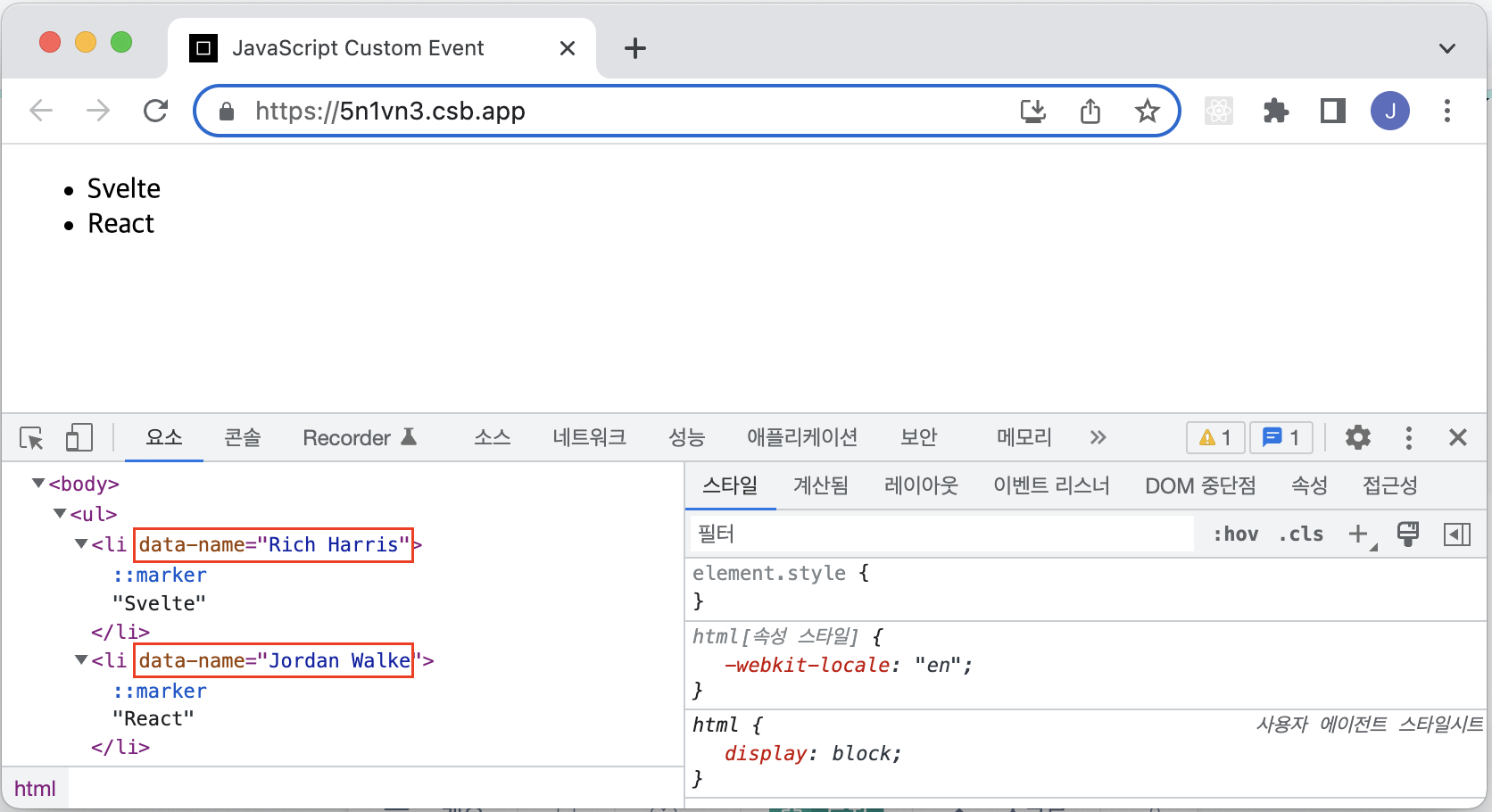 HTML 요소에 정보를 추가하려면 커스텀 애트리뷰트가 아닌 "data-"로 시작하는 data 애트리뷰트를 사용한다.