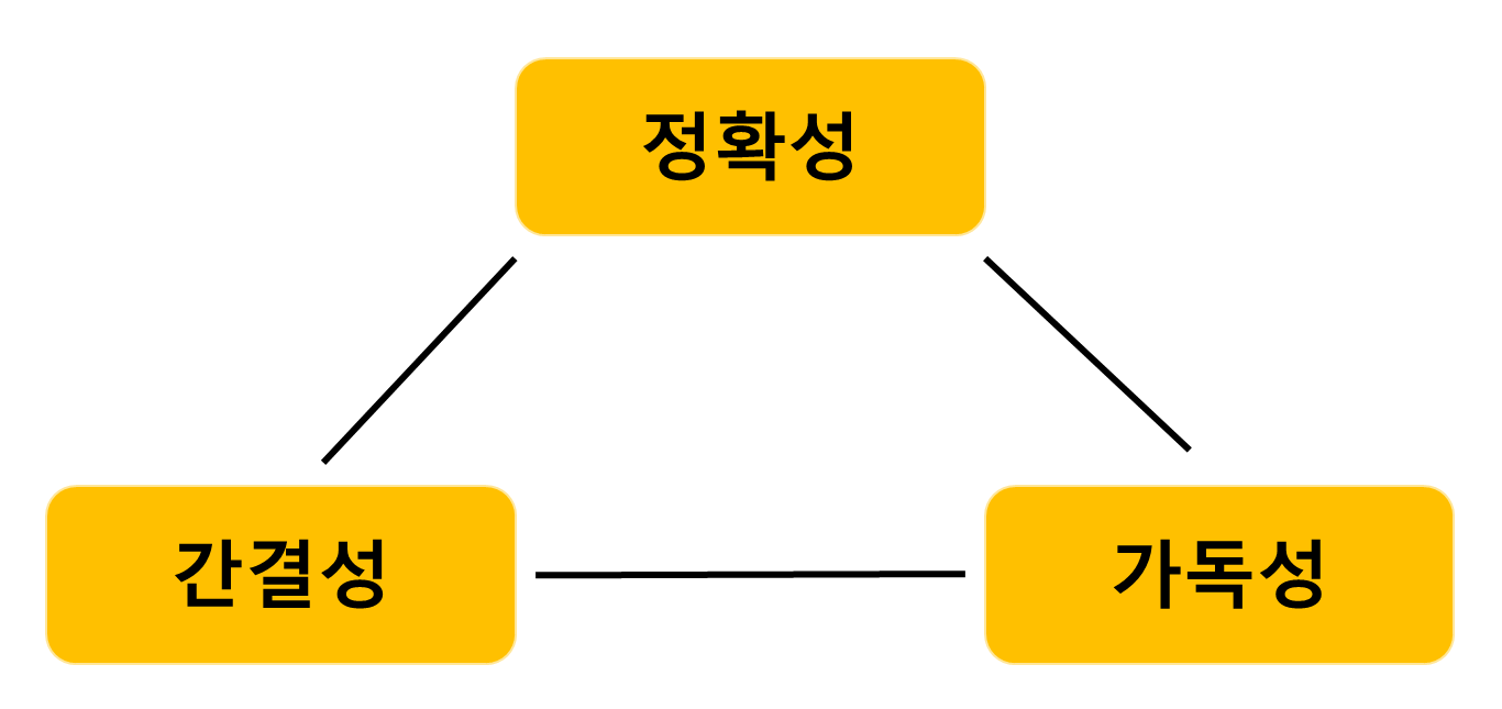 정확성이 높으면 간결성과 가독성이 떨어지고, 간결성이 높으면 정확성과 가독성이 떨어지고, 가독성이 높으면 정확성과 간결성이 떨어진다.