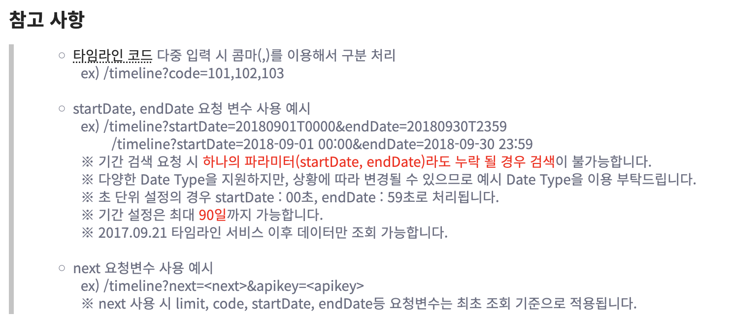 아래는 던전 앤 파이터 API 문서에서 개조식으로 작성된 글이며 중요한 부가 설명은 당구장 기호와 서술식으로 작성된 것을 알 수 있다.