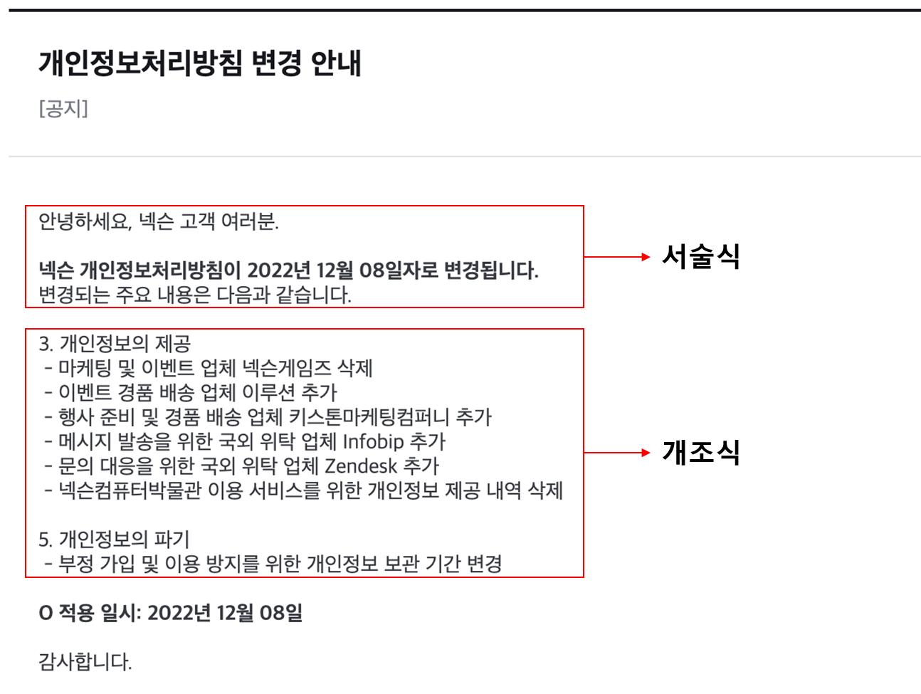 아래는 개인정보처림 방침 변경 안내에 대한 넥슨 공지 사항인데, 서술식과 개조식으로 작성된 것을 확인할 수 있다.