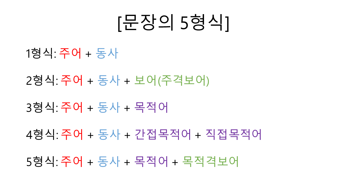 토익을 처음 입문하면 '영어 5 형식 문장'에 대해 배우게 된다. 기본적으로 모든 문장은 주어, 동사가 존재하며 문장의 의미를 좀 더 자세하게 표현하기 위해 보어, 목적어, 수식어가 사용되기도 한다.
