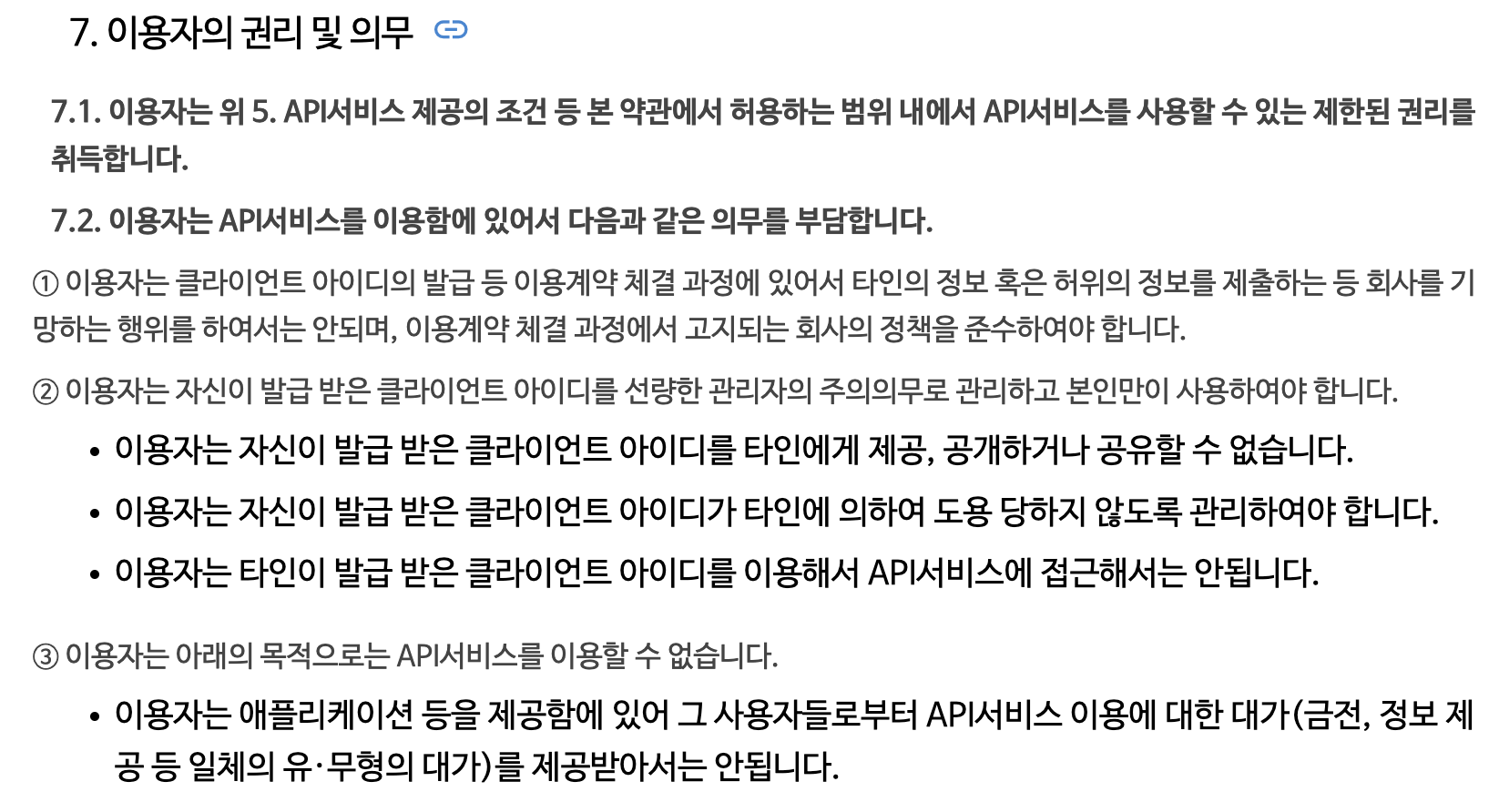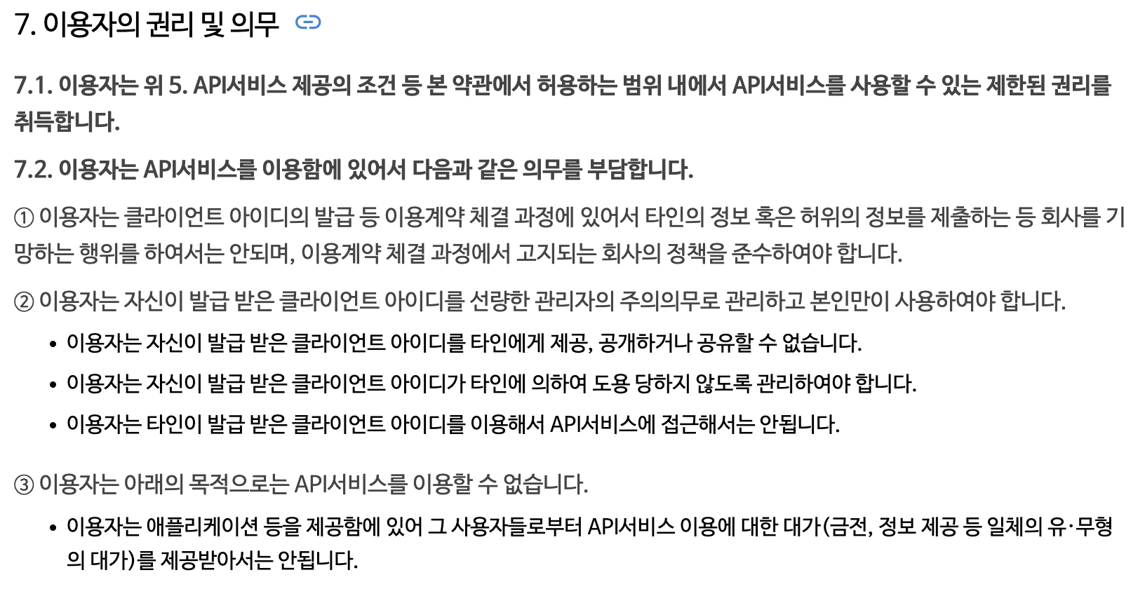 아래는 NAVER API 서비스 이용약관에서 이용자의 권리 및 의무에 대한 내용이다.