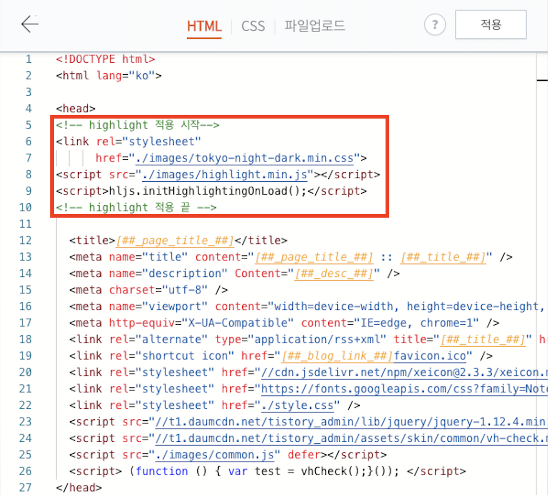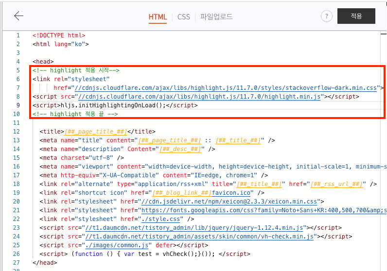 이번에는 CDN 방식이 아닌 css와 js 파일을 티스토리에 업로드해서 highlight 라이브러리를 적용하는 방법을 설명한다.