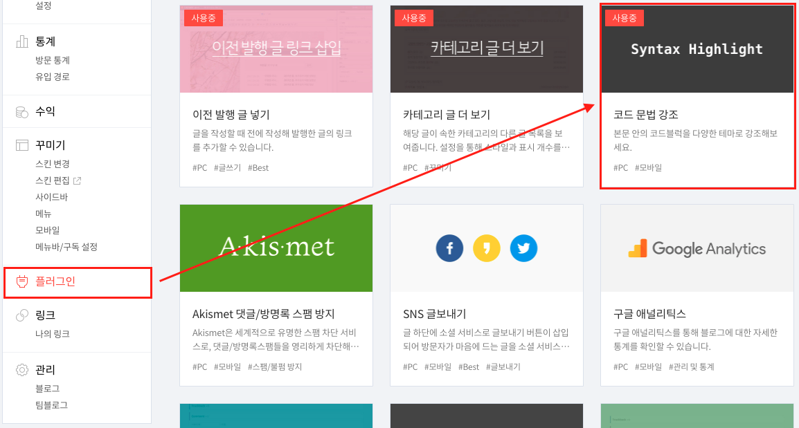 관리자 페이지에 접속 후 아래 스크린샷처럼 [플러그인 > 코드 문법 강조]를 클릭한다.