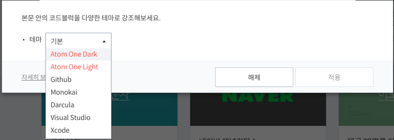 좌측에서 원하는 테마와 프로그래밍 언어를 선택할 수 있으며, 우측에 적용된 테마를 확인할 수 있다.