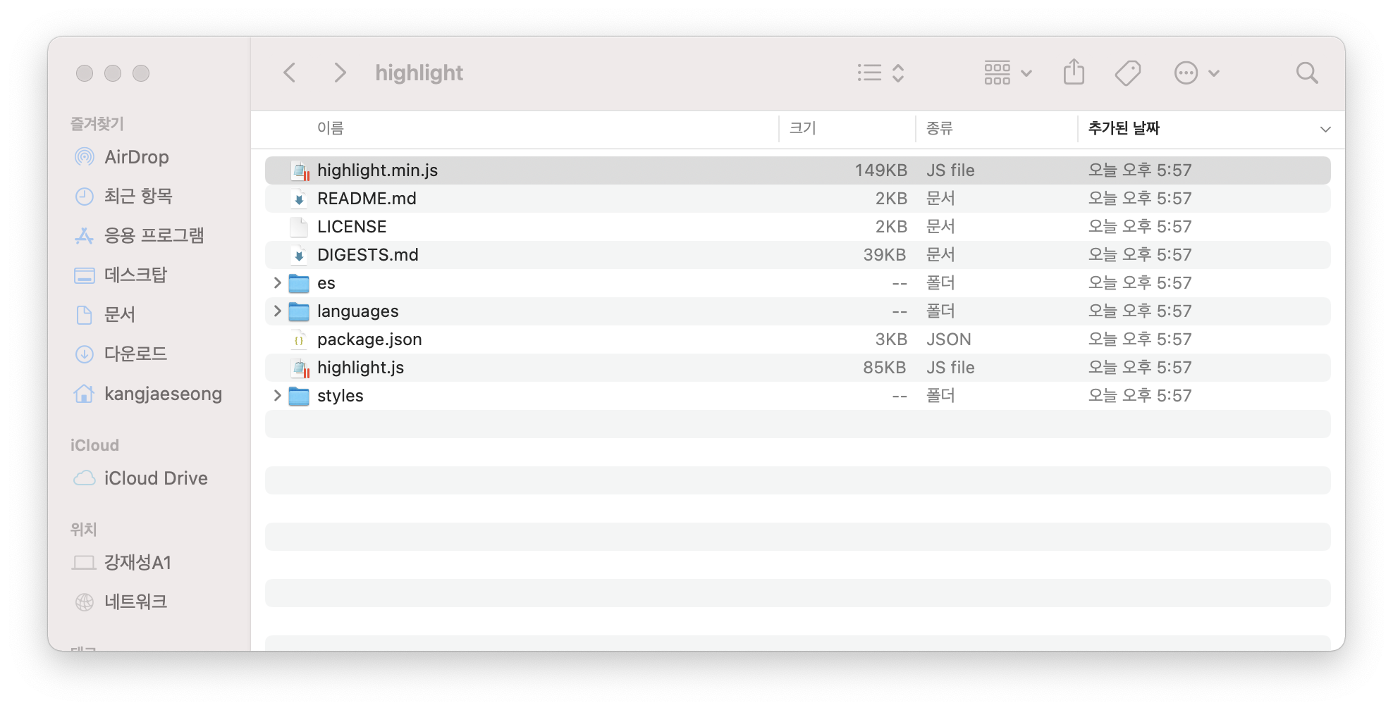 티스토리에 업로드할 파일은 'highlight.min.js' 파일과 'styles' 폴더에 있는 파일이다. 'highlight.min.js' 파일은 highlight 코드블럭을 적용하는 JavaScript 코드가 존재하는 파일이며 'styles' 폴더에는 테마별로 css 파일이 존재한다.