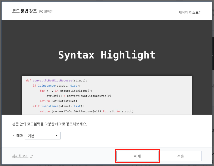 만약, highlight 테마가 적용되지 않았다면 [티스토리 관리자 페이지 > 플러그인 > 코드 문법 강조]를 선택한 다음 '해제'를 클릭한다.