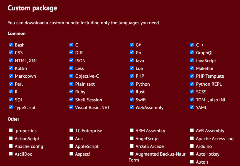 스크롤을 내리다 보면 Custom package라는 목차를 볼 수 있는데, 'Common'은 대중화된 프로그래밍 언어를 나타내며 기본적으로 체크되어 있다. 'Other는 그 이외의 것들을 말하며 기본적으로 체크가 해제되어 있다.