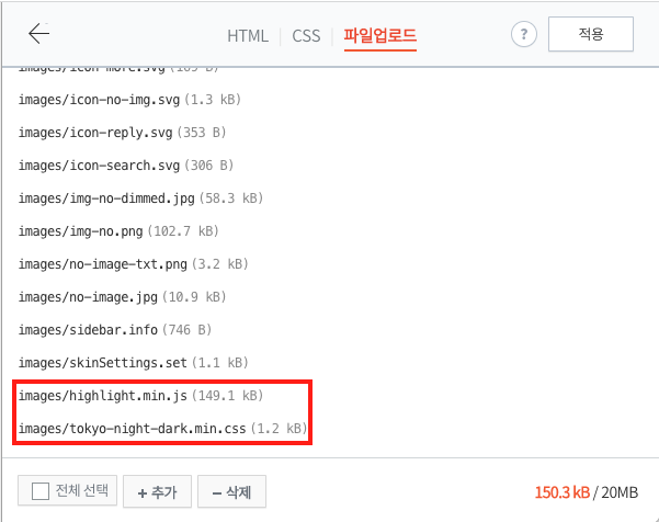 하단의 '+ 추가'를 클릭해서 'highlight.min.js'파일과 적용하려는 테마 css 파일을 업로드하자. 이번에는 'Tokyo Night Dark' 테마를 적용하기 위해 'tokyo-night-dark.min.css' 파일을 선택했다. 두 개의 파일을 추가했으면 우측 상단의 '적용'을 클릭한다.
