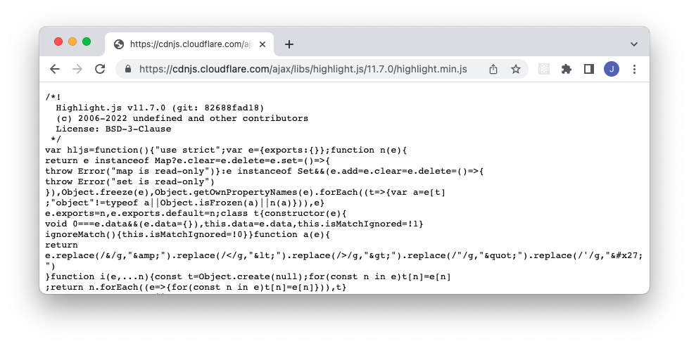 아래 스크린샷은 웹 브라우저에서 cdnjs.cloudflare.com/ajax/libs/highlight.js/11.7.0/highlight.min.js를 입력한 결과다.
