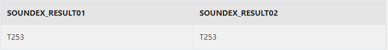 SELECT SOUNDEX('apples') AS SOUNDEX_RESULT01 , SOUNDEX('applus') AS SOUNDEX_RESULT02 FROM DUAL;