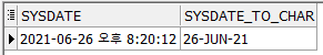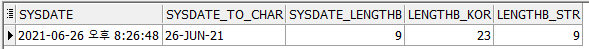 LENGTHB함수는 SYSDATE의 값 '26-JUN-21'를 문자열로 변환 후 Byte를 수를 반환합니다.