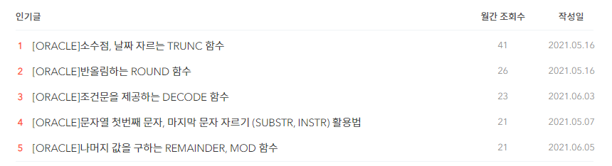 그중 오라클에 대해 작성한 글이 23개인데, 6월 인기글 1~20위에서 14개가 오라클에 대한 글이었습니다.