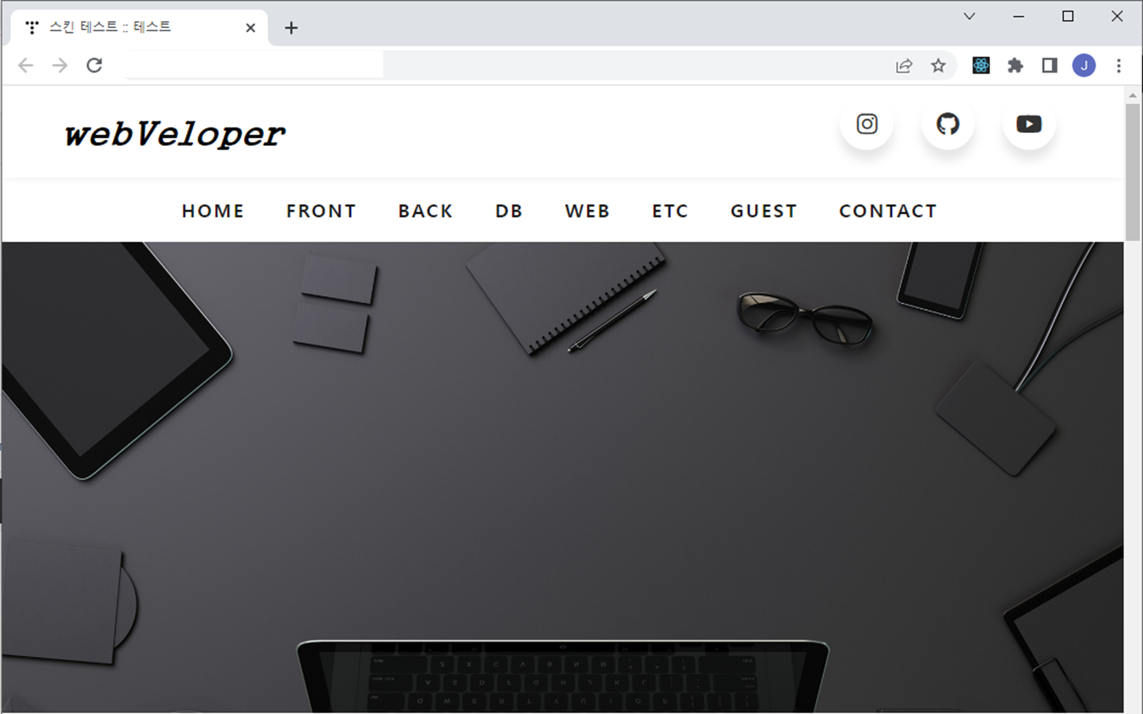 세 번째 이유는 블로그 브랜딩입니다. 개인 도메인을 구입한 목적은 제 블로그를 브랜딩 시키기 위해서였는데, 기존 블로그에 개인 도메인을 설정하면 여러 문제가 발생하다 보니 브랜딩 하는 게 불가능한 상황입니다. 그리고 남들과 차별화된 블로그라는 것을 어필하기 위해 스킨을 제작하고 있습니다. 현재, 아래 스크린샷처럼 헤더만 구현된 상황이며 계속해서 디자인 및 기능을 구현하고 있습니다.
